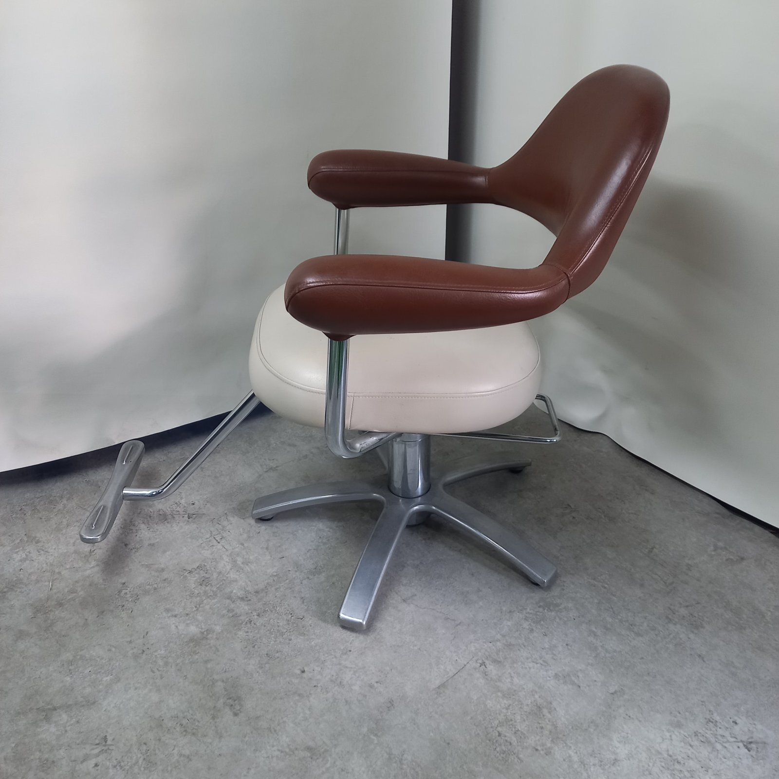 使う人にとって、美しく、作業しやすく、年月とともに愛着が湧く・・・・。そして何よりも、座る人に心地いい快適さを。最新のエルゴノミクス・デザインが実現した、サロンチェアの新しい世界。アームレストからバックレストにかけて、なだらかなカーブを描き山をイメージした、和を感じさせる繊細なデザインです。(デザイン:喜多俊之)