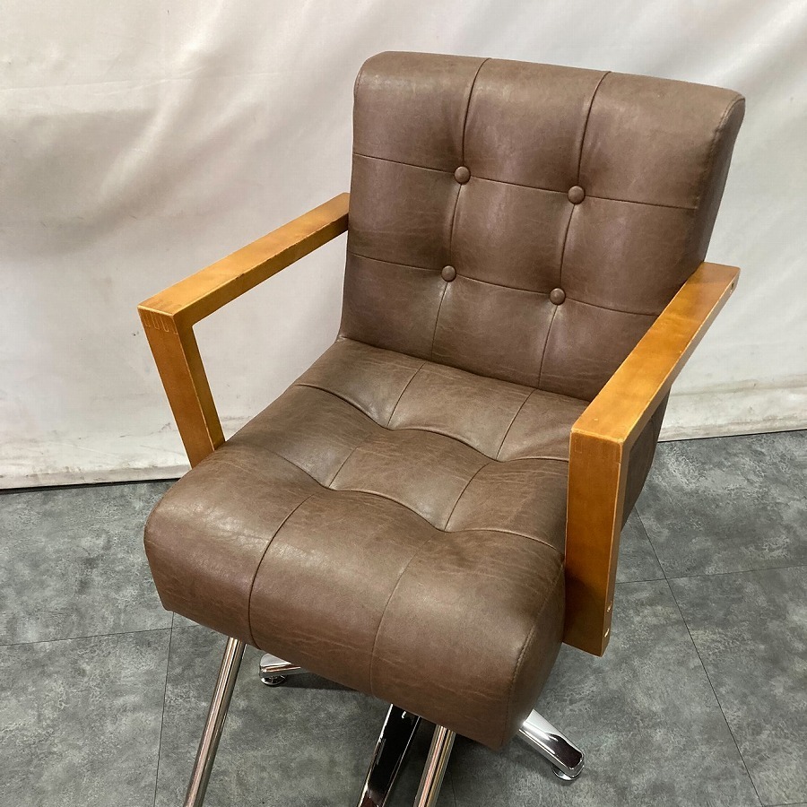天然木のアームレストに、ボタン加工で表情をつけたソファタイプの座面を組み合わせ、落ち着きのある存在感を持たせています。