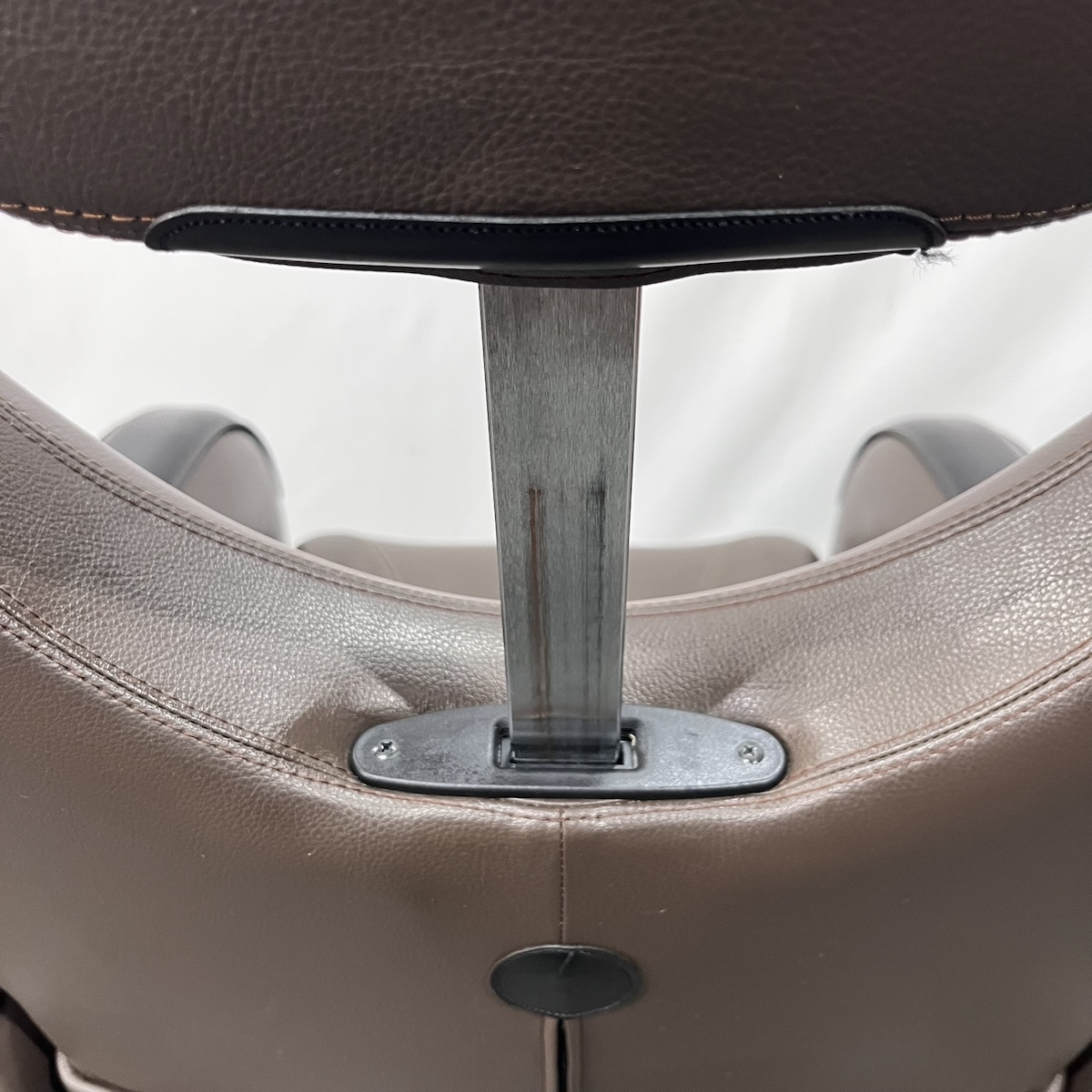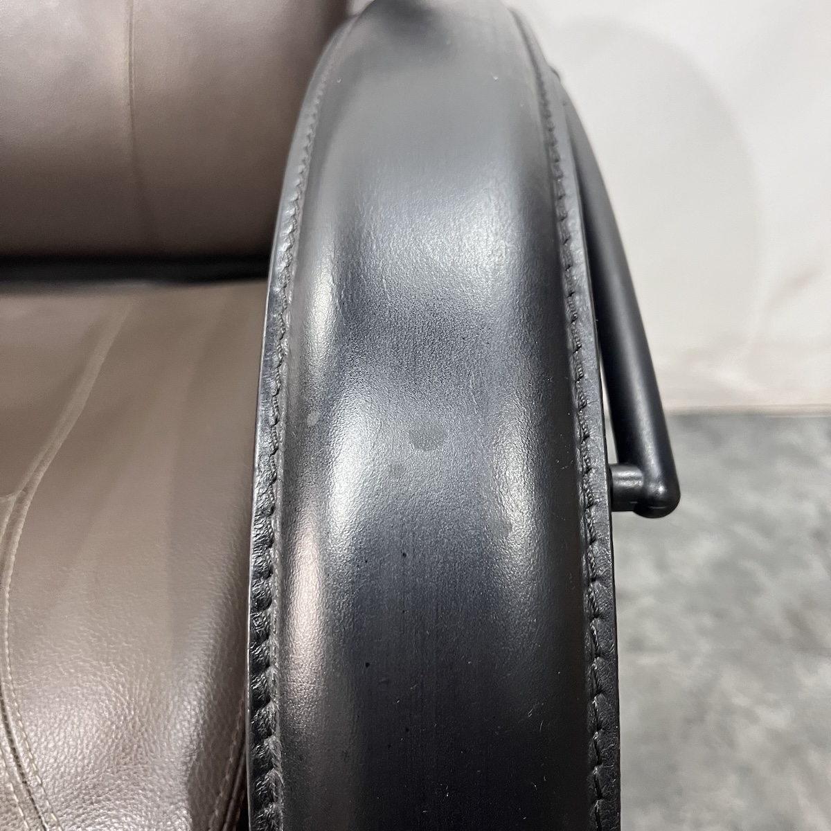 ※肘部分: 本革アームレスト部分に使用感がございます。こちらの部分は本革ですので、強い洗剤をご使用されると色落ちいたします。ご注意ください。(こちらの本革部分も含めてのお張替えをご検討のお客様は、ご連絡ください。)