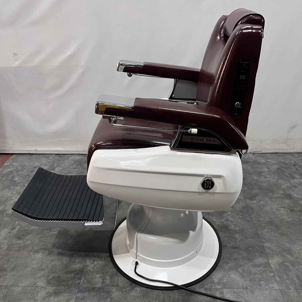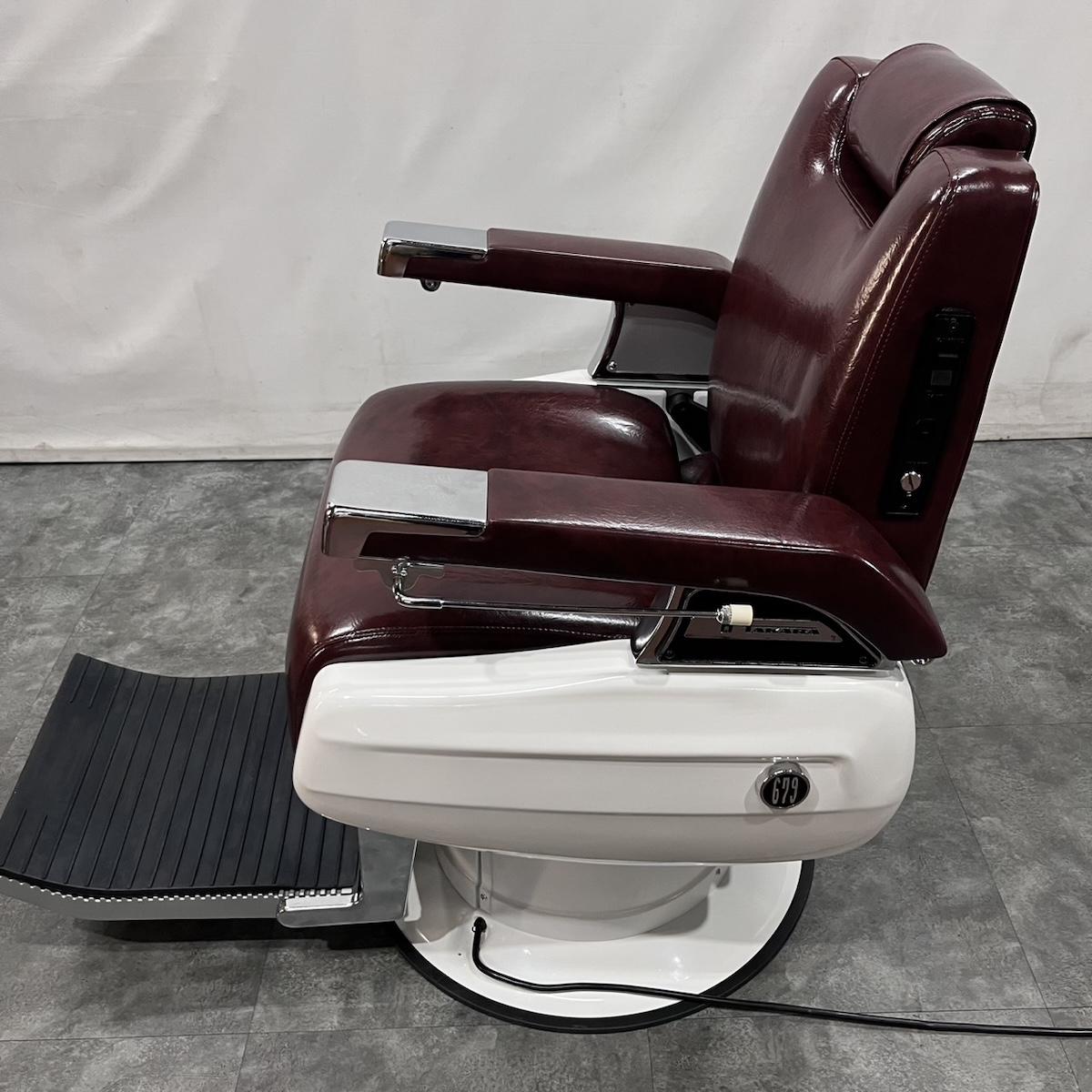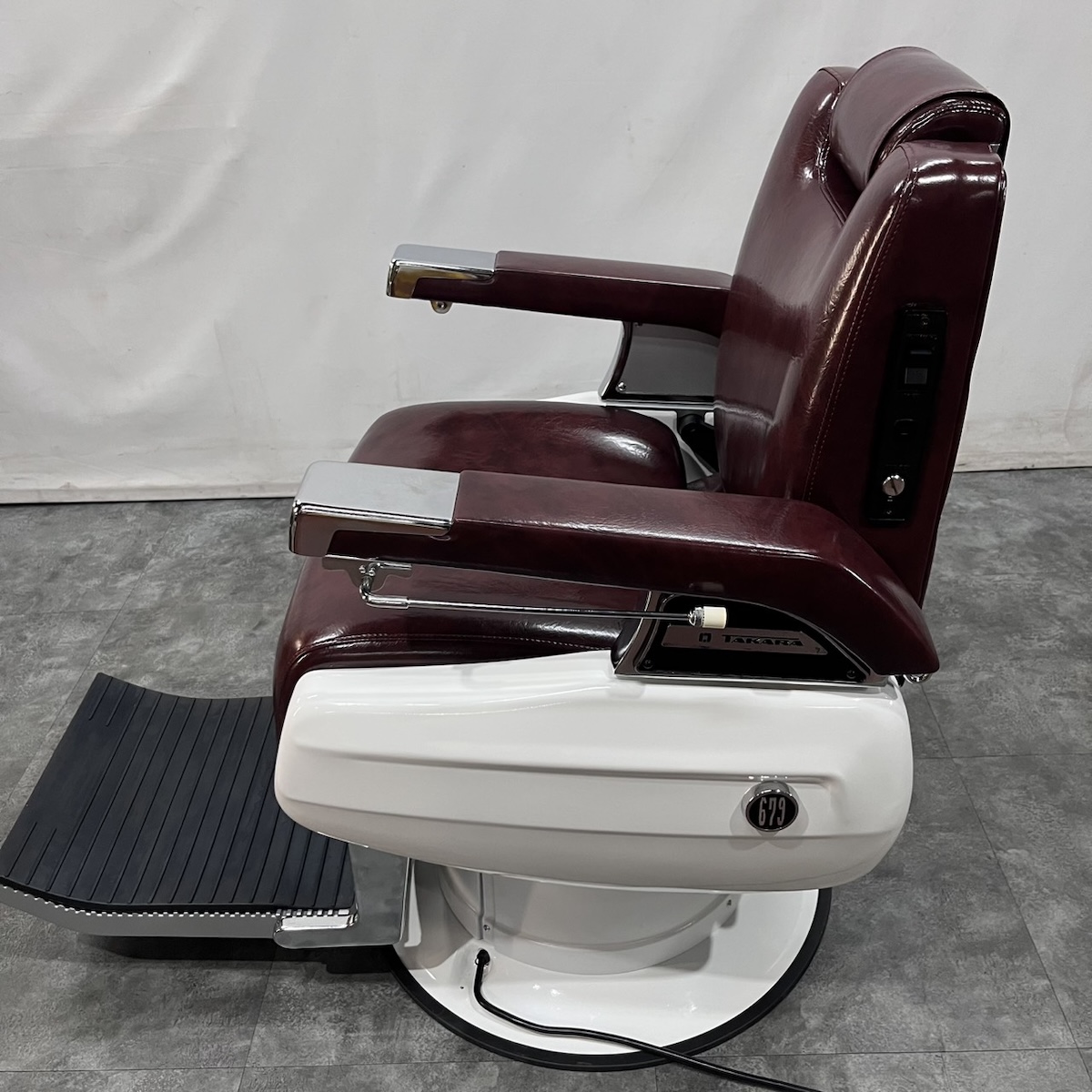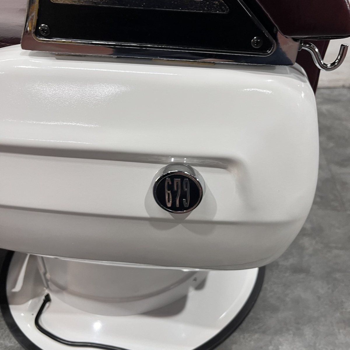 タカラベルモント製 理容椅子 『 679 』入荷しました! ※こちらの商品は、再生品の見本写真となります。(再生品とは、シートの張替え・メッキ部分の再メッキ・塗装部分の再塗装・機械部分のメンテナンスを行った商品です。)ご注文を頂いてから作業に入りますので、お好みのレザーに張り替えることができます。 国産メーカー(シンコー又はサンゲツ)の合皮レザーにてご希望のシートに張り替えます。300色以上の取り扱いがありますので、ご希望の色の系統をお知らせいただけましたらレザーサンプルをご用意いたします。 また、塗装色はアイボリー・白・黒からお選びいただけます。(その他の色については、一度お問い合わせください。) 納期は約3週間かかります。 【送料別途】送料はご地域によりますので、ご連絡ください。
