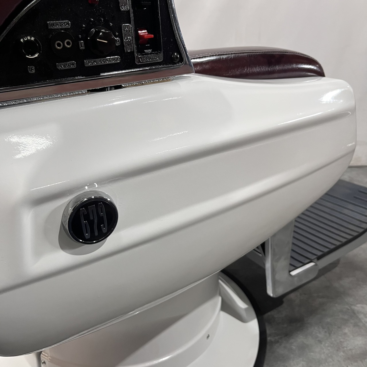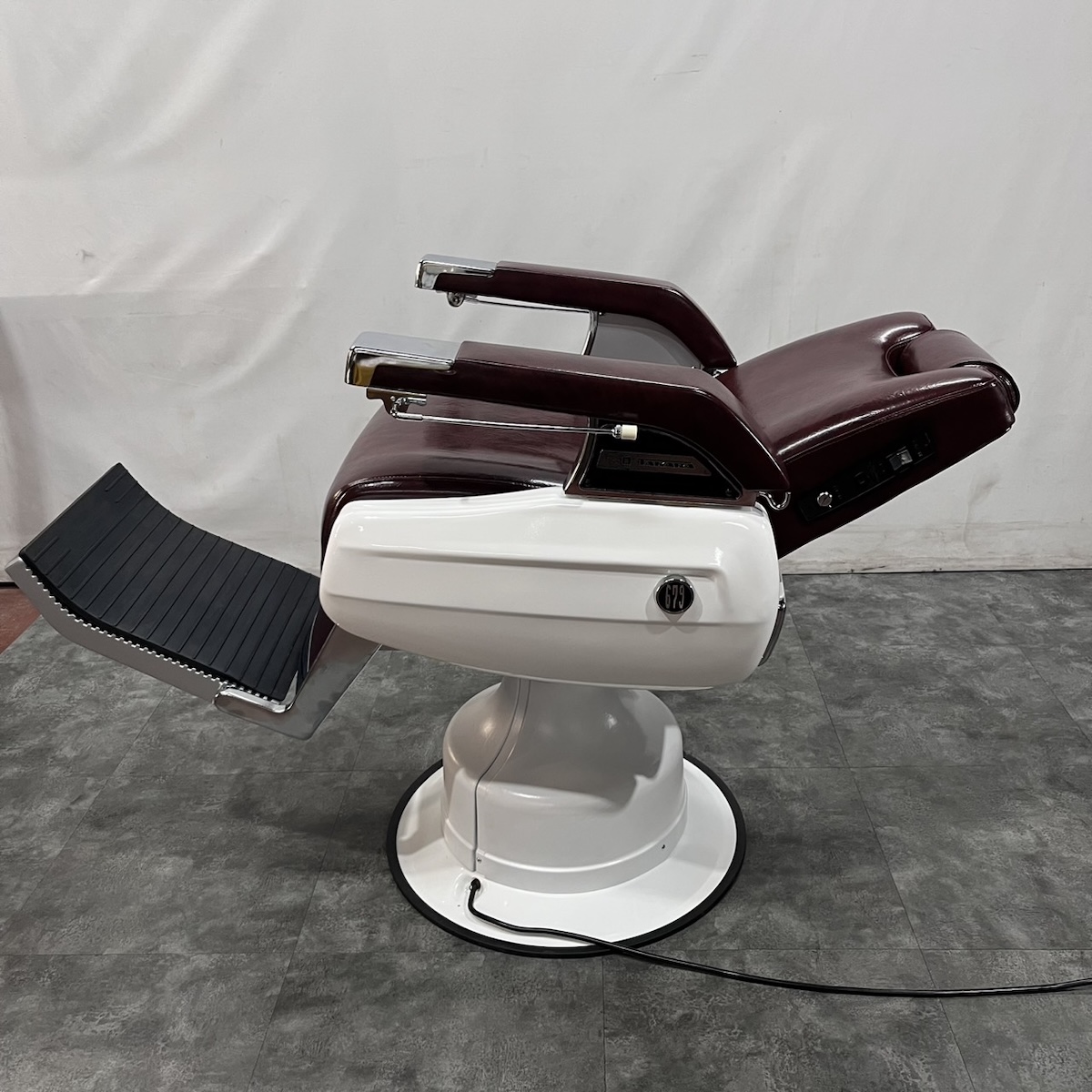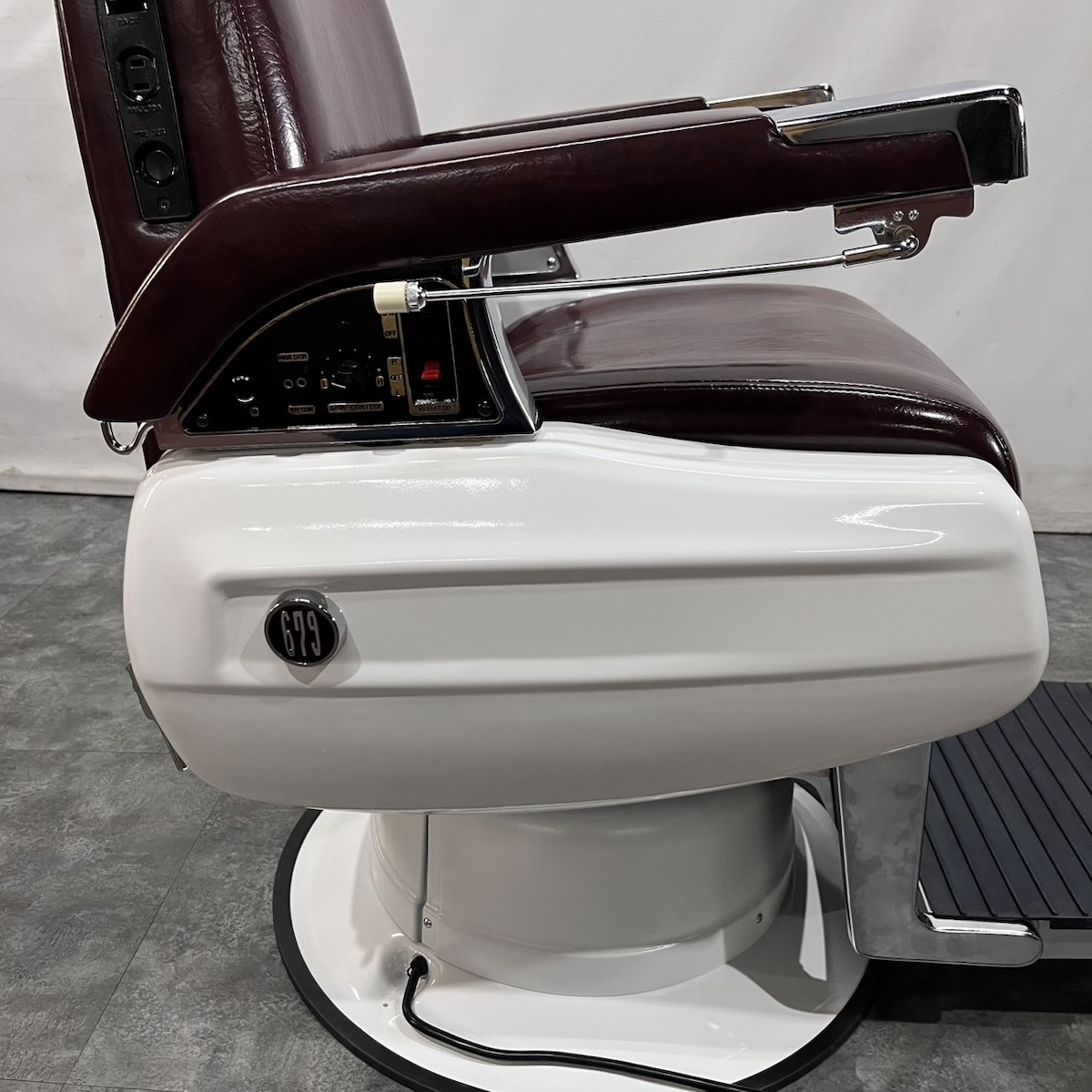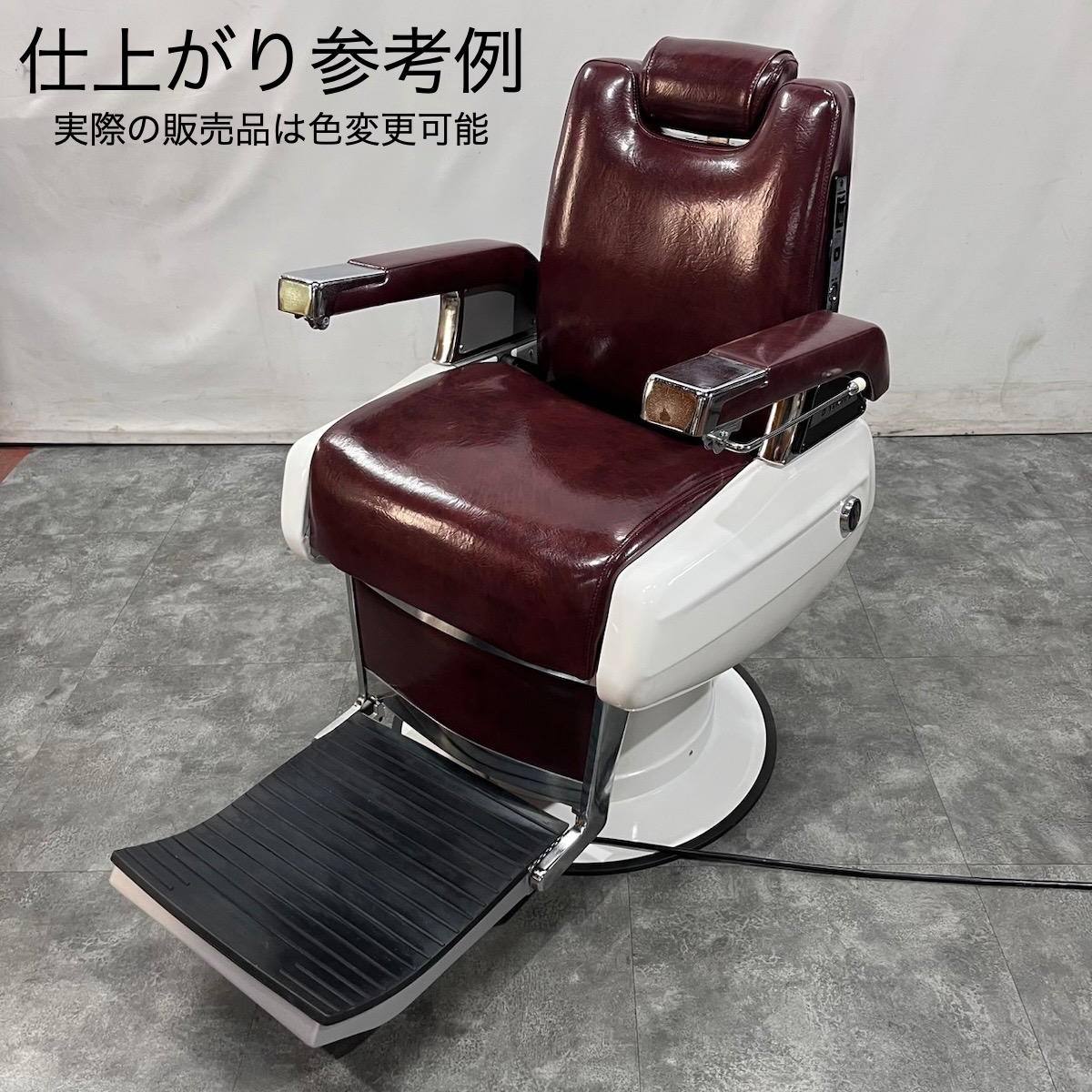タカラベルモント製 理容椅子 『 679 』入荷しました! ※こちらの商品は、再生品の見本写真となります。(再生品とは、シートの張替え・メッキ部分の再メッキ・塗装部分の再塗装・機械部分のメンテナンスを行った商品です。)ご注文を頂いてから作業に入りますので、お好みのレザーに張り替えることができます。 国産メーカー(シンコー又はサンゲツ)の合皮レザーにてご希望のシートに張り替えます。300色以上の取り扱いがありますので、ご希望の色の系統をお知らせいただけましたらレザーサンプルをご用意いたします。 また、塗装色はアイボリー・白・黒からお選びいただけます。(その他の色については、一度お問い合わせください。) 納期は約3週間かかります。 【送料別途】送料はご地域によりますので、ご連絡ください。