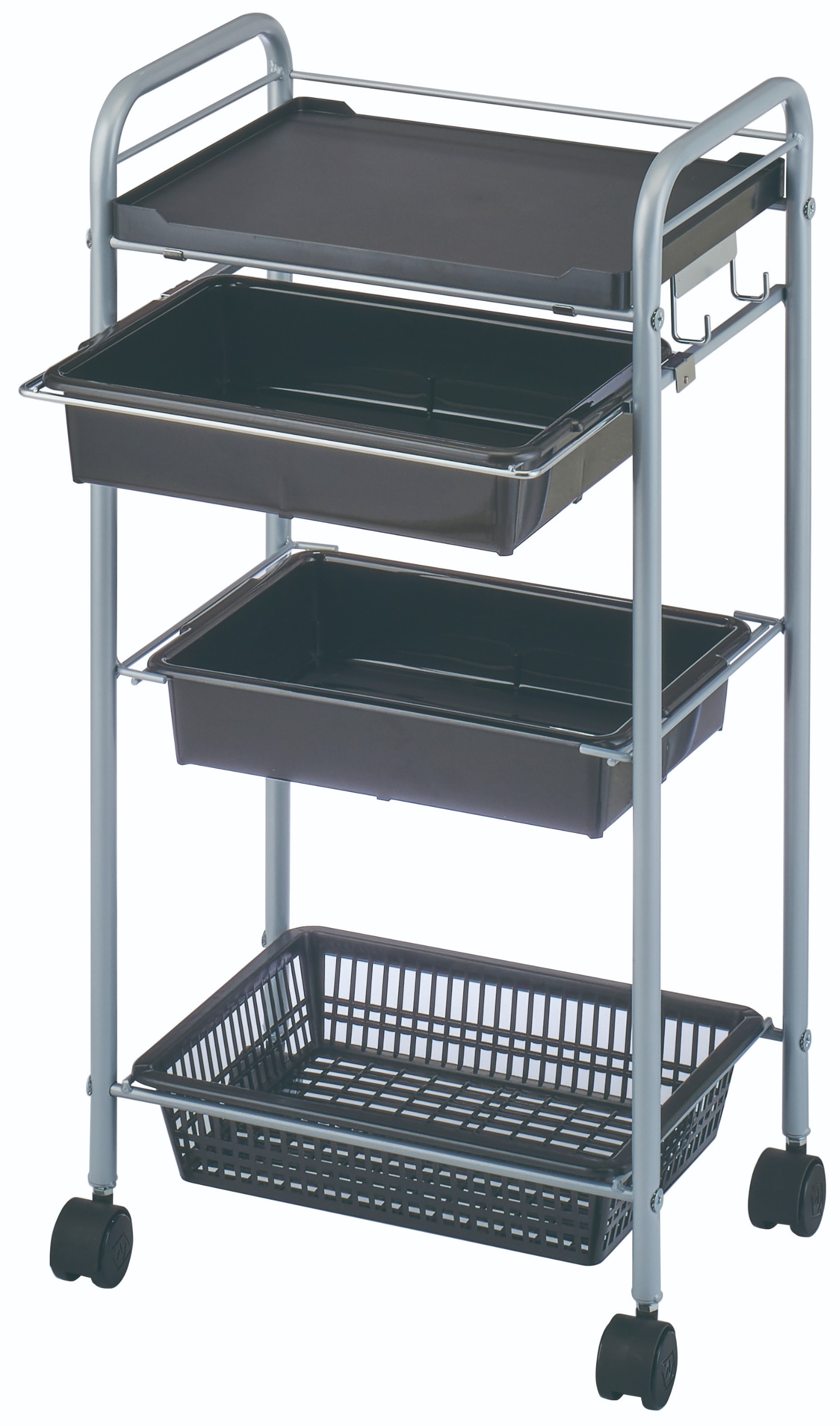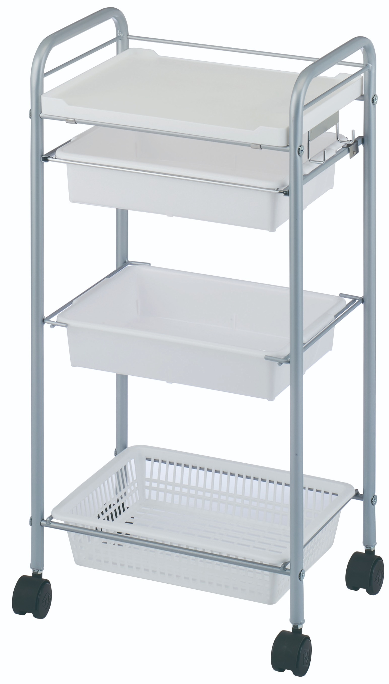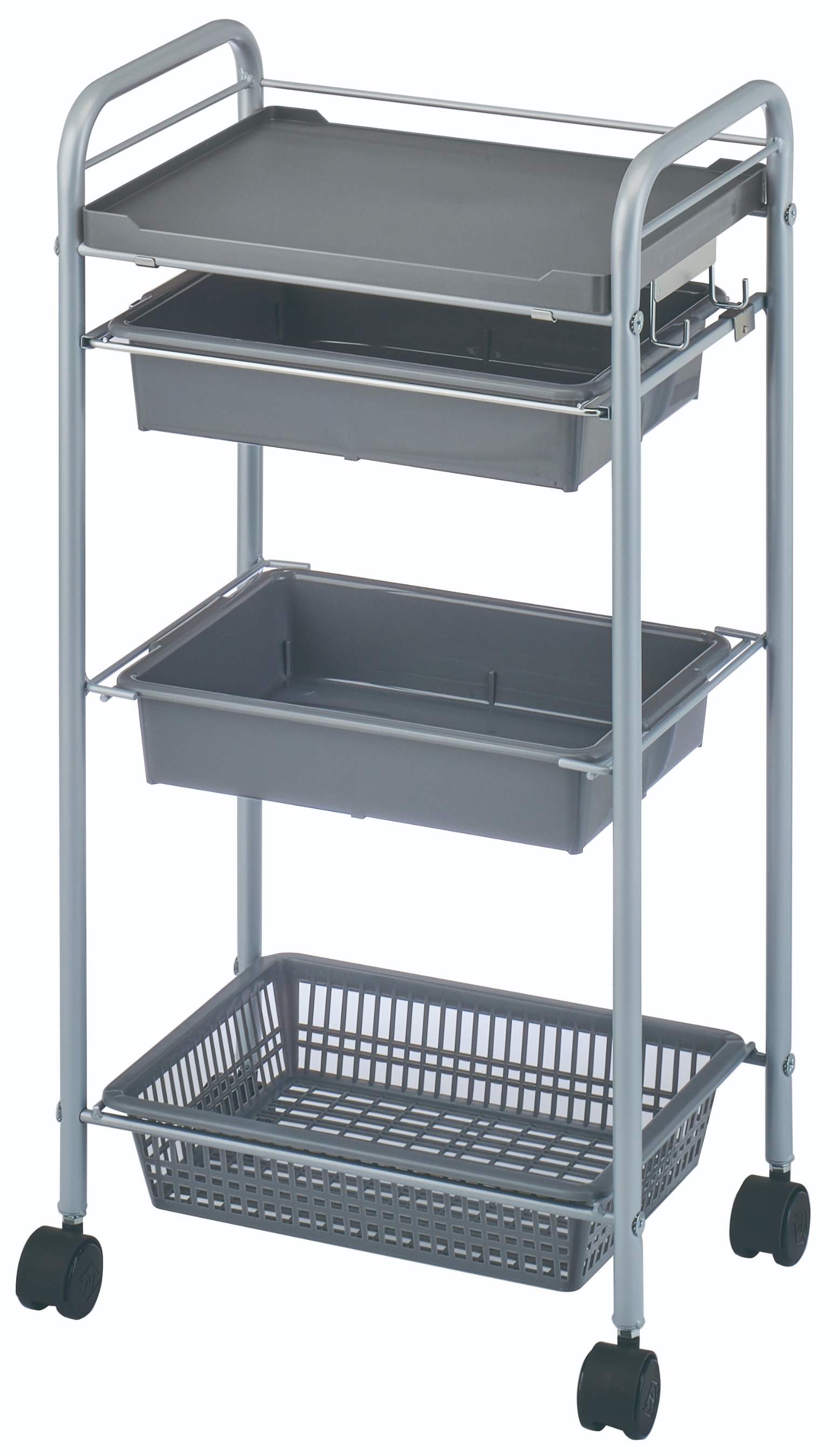 深型引き出しパッド1段・固定深型パッド1段・固定カゴ1段を備えた、機能性とシンプルさを兼ね備えたスタンダードセットワゴン。
